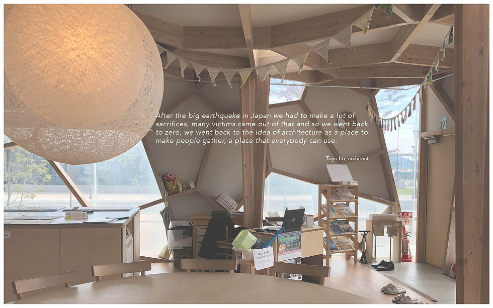 Minna no Ie - "Home-for-All" community houses are built in the areas of temporary housing and fishing harbors. where people could feel like at home, meet, relax and talk about the future of their city. The voluntary organisation is lead by Toyo Ito, Kazuyo Sejima, and Riken Yamamoto, they have been working closely with younger architects to help make a difference in the disaster area. Their intention is very simple, they think the idea of architecture should be back to its original intent, a place to make people gather, a place that everybody can use, rather than just economic vases. The work was displayed in the 13th Venice Biennale and was awarded the Golden Lion for Best National Participation, and Toyo Ito shared the prize with all the people affected by the tsunami. The project got a lot of international attention.